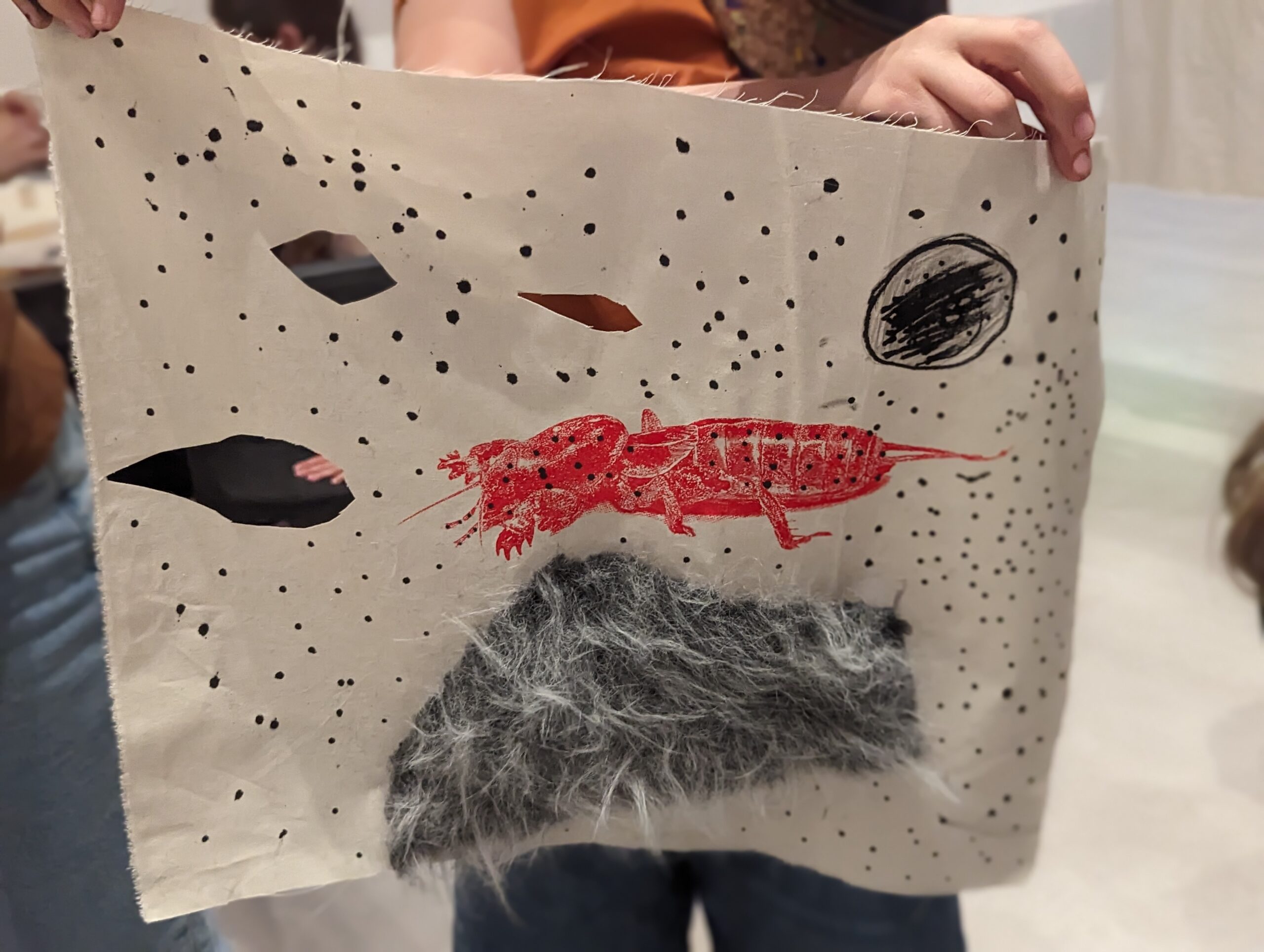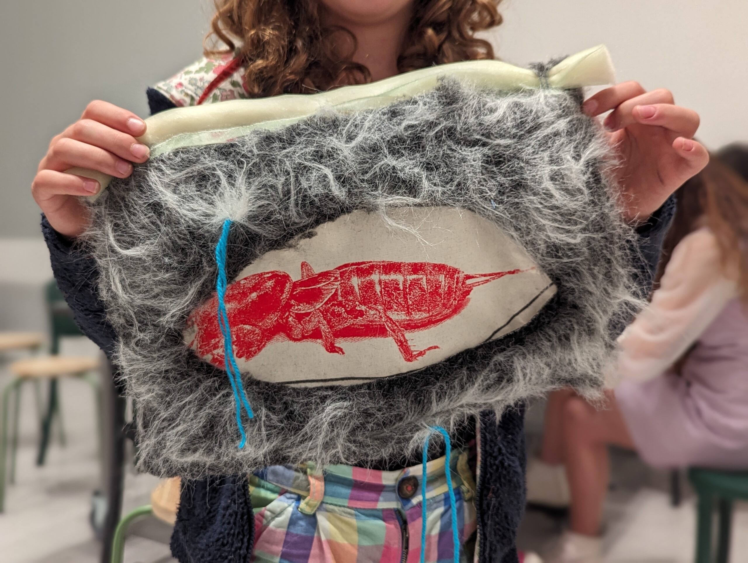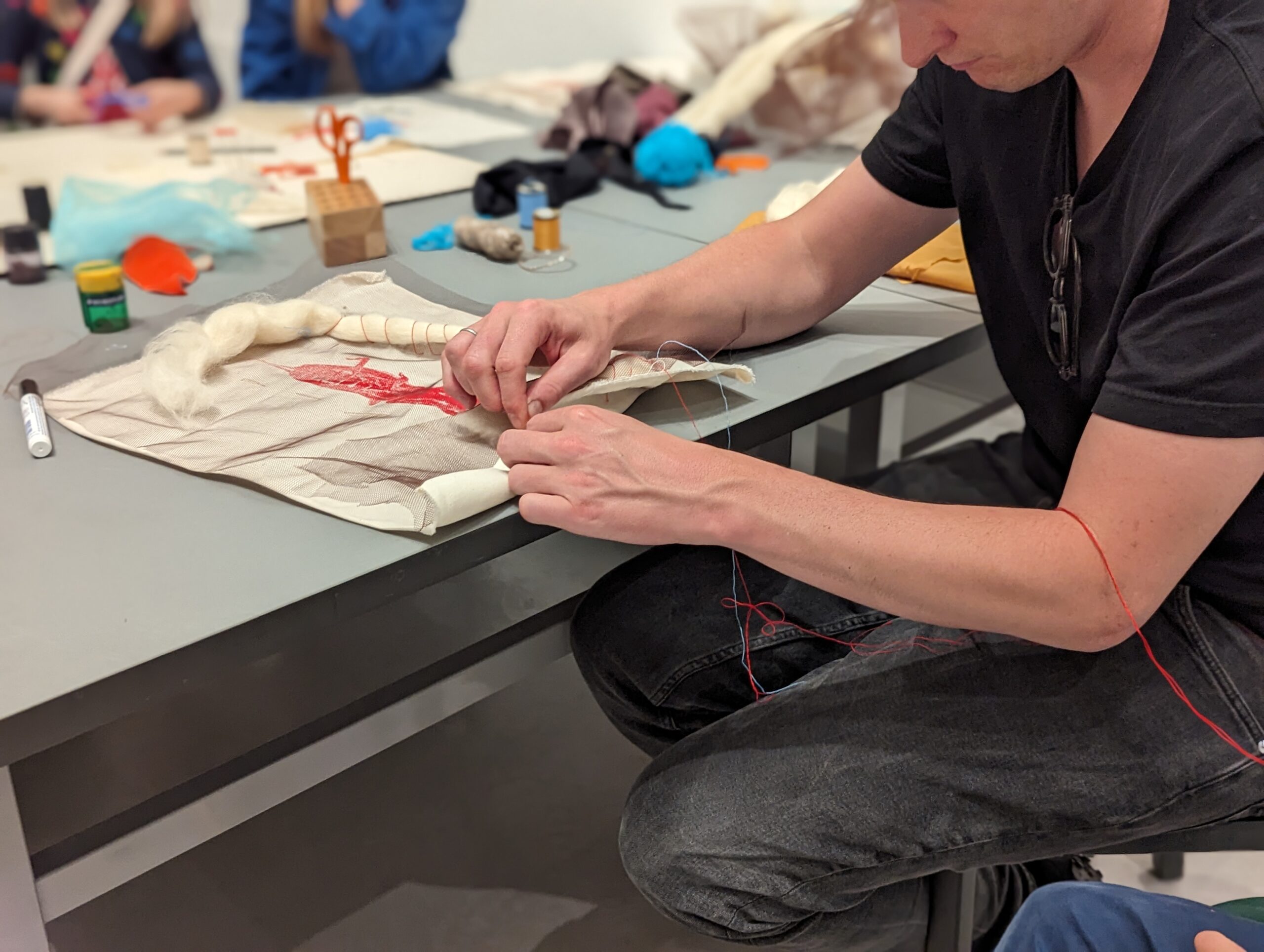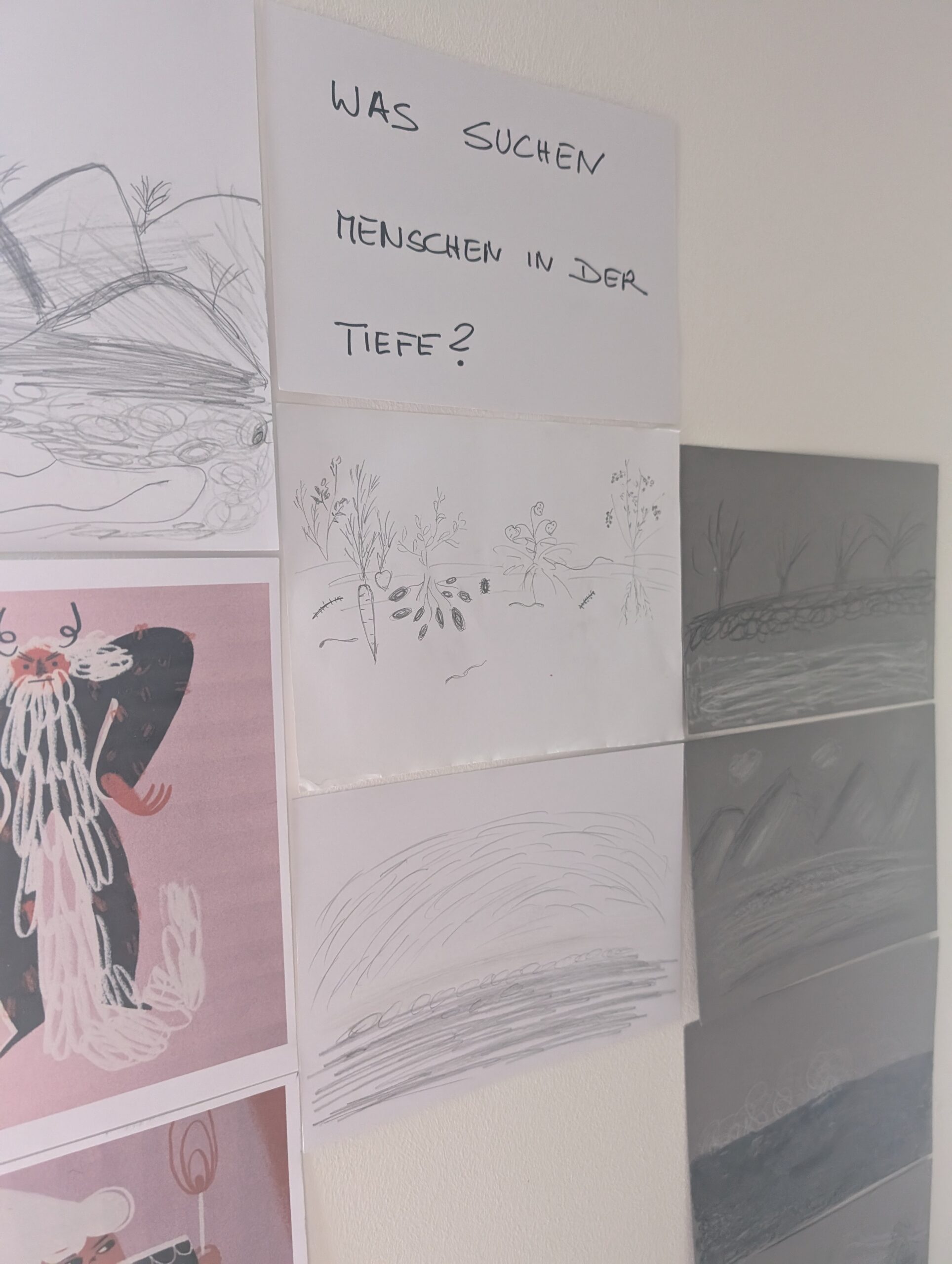 Über einen Zeitraum von sechs Monaten trafen wir uns regelmäßig in den Räumen der Berlinischen Galerie, um der Frage nachzugehen: „Welche Geheimnisse verbirgt die Tiefe?“. In intensiven Experimenten beschäftigten wir uns mit diesem Thema, untersuchten Bodenproben, zeichneten und druckten, um die verborgenen Geheimnisse der Tiefe zu ergründen. Unsere Erkenntnisse hielten wir schließlich auf Stoff fest. Bei der abschließenden Präsentation in der Berlinischen Galerie waren alle Interessierten eingeladen, sich an einer künstlerischen Nähaktion zu beteiligen. Dabei konnten sie den Pfad einer Maulwurfsgrille in die unsichtbare Welt der Tiefe nacherleben und eigene textile Bilder kreieren.