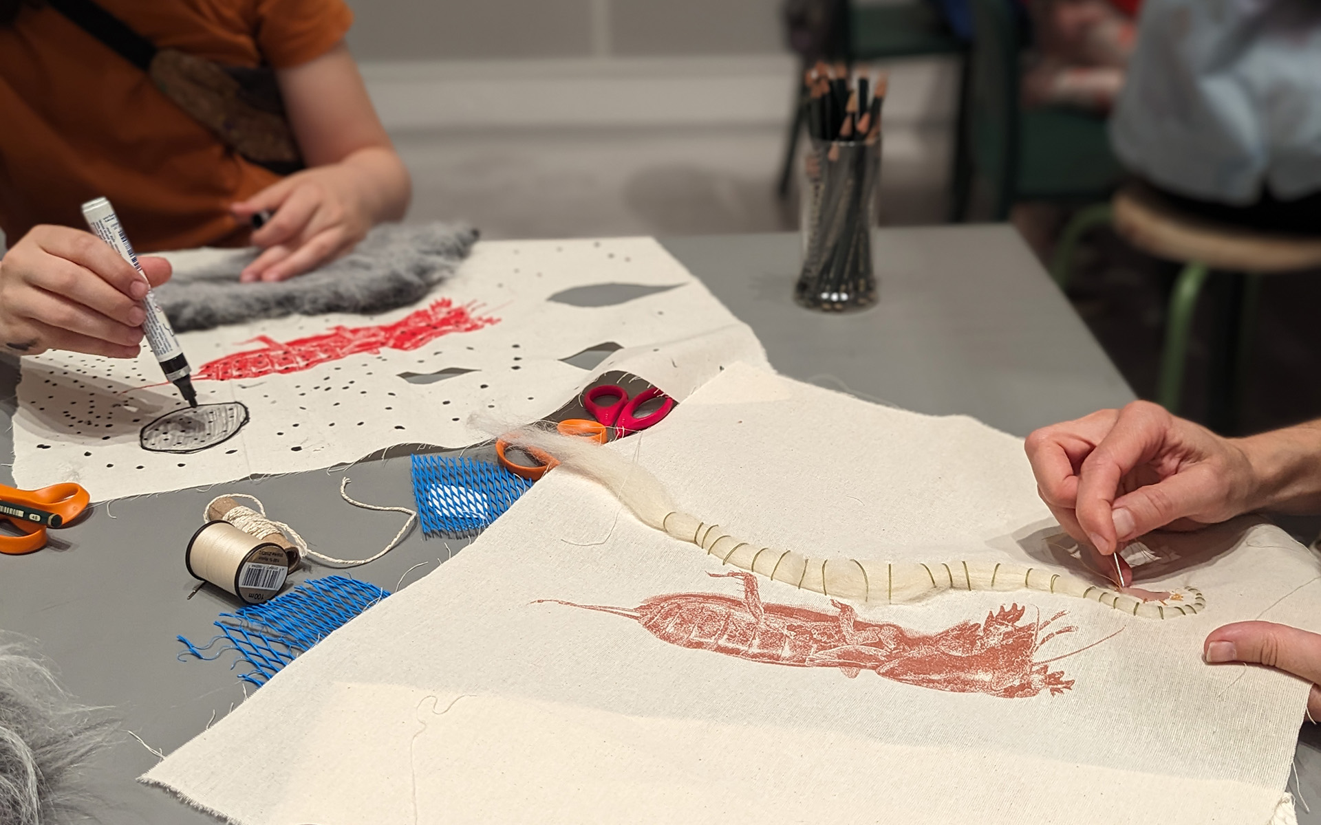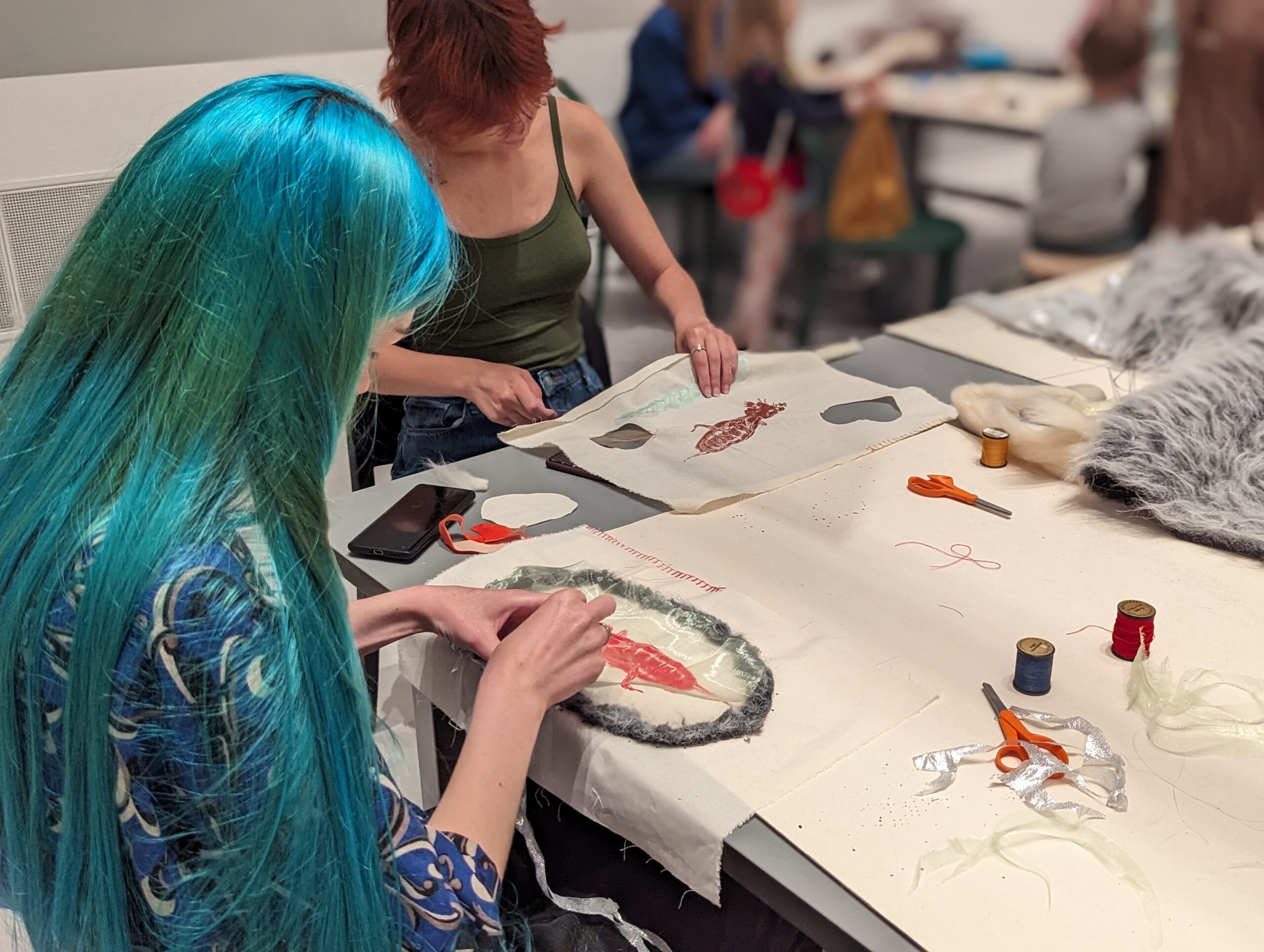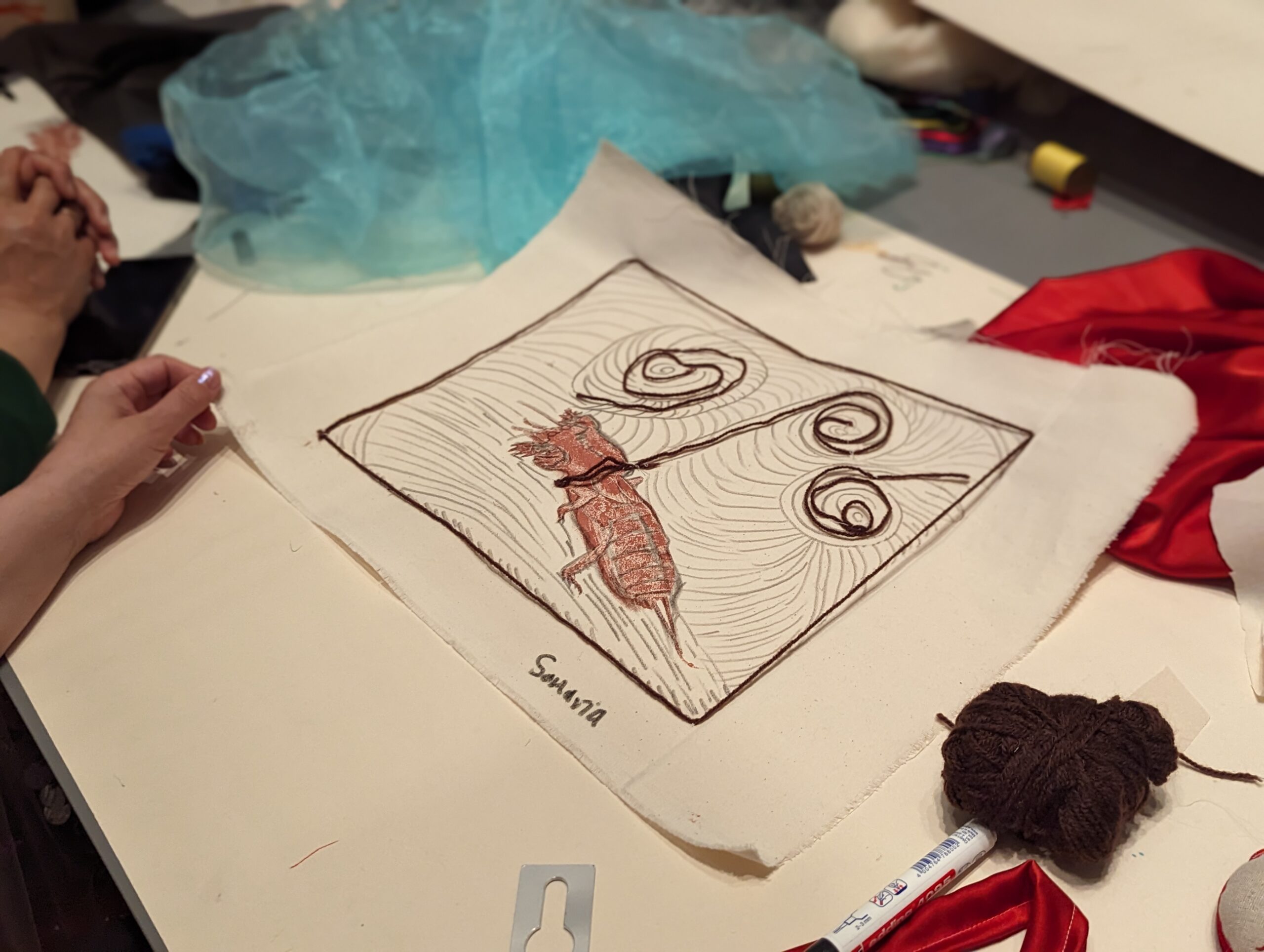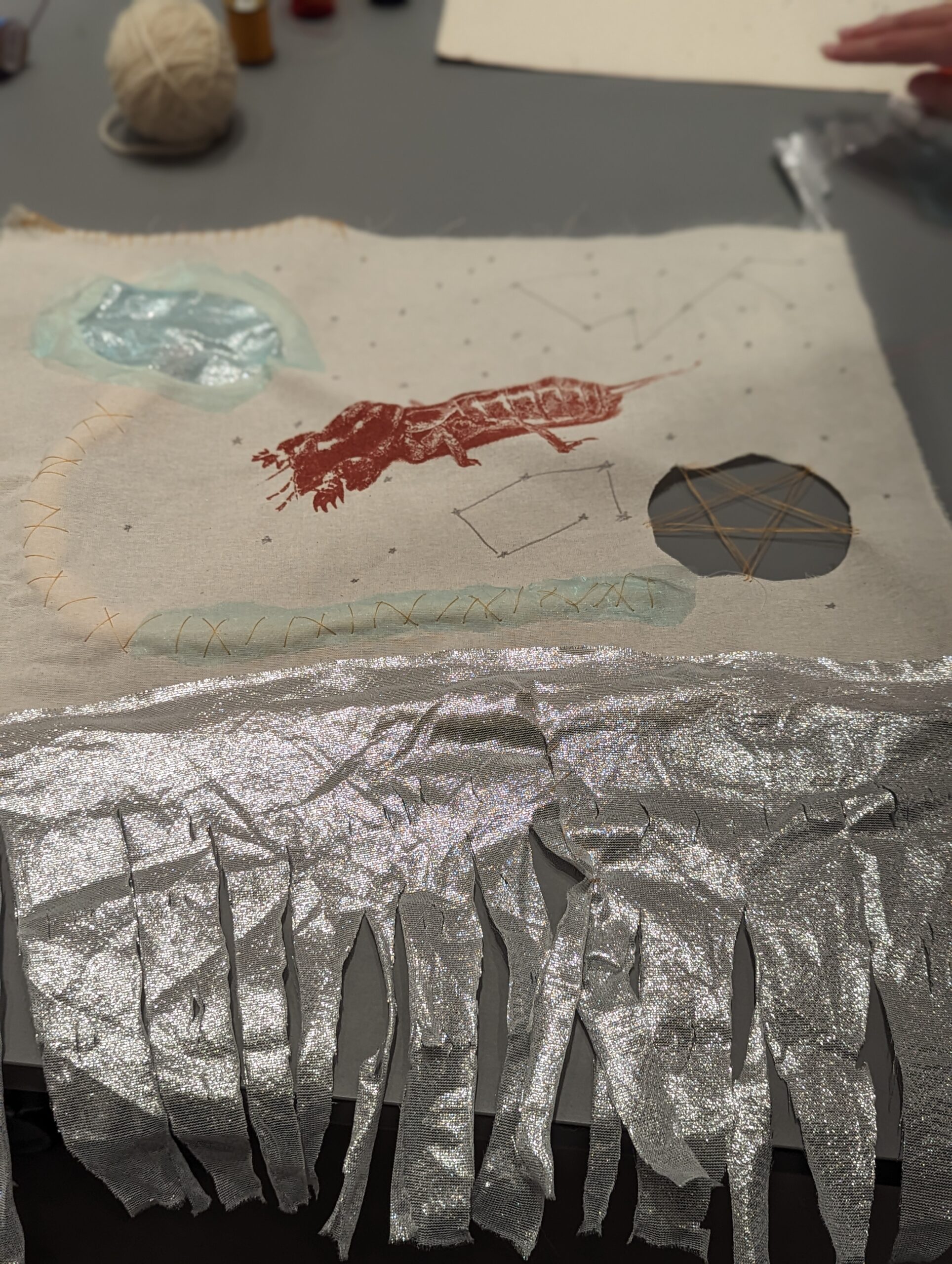 Über einen Zeitraum von sechs Monaten trafen wir uns regelmäßig in den Räumen der Berlinischen Galerie, um der Frage nachzugehen: „Welche Geheimnisse verbirgt die Tiefe?“. In intensiven Experimenten beschäftigten wir uns mit diesem Thema, untersuchten Bodenproben, zeichneten und druckten, um die verborgenen Geheimnisse der Tiefe zu ergründen. Unsere Erkenntnisse hielten wir schließlich auf Stoff fest. Bei der abschließenden Präsentation in der Berlinischen Galerie waren alle Interessierten eingeladen, sich an einer künstlerischen Nähaktion zu beteiligen. Dabei konnten sie den Pfad einer Maulwurfsgrille in die unsichtbare Welt der Tiefe nacherleben und eigene textile Bilder kreieren.